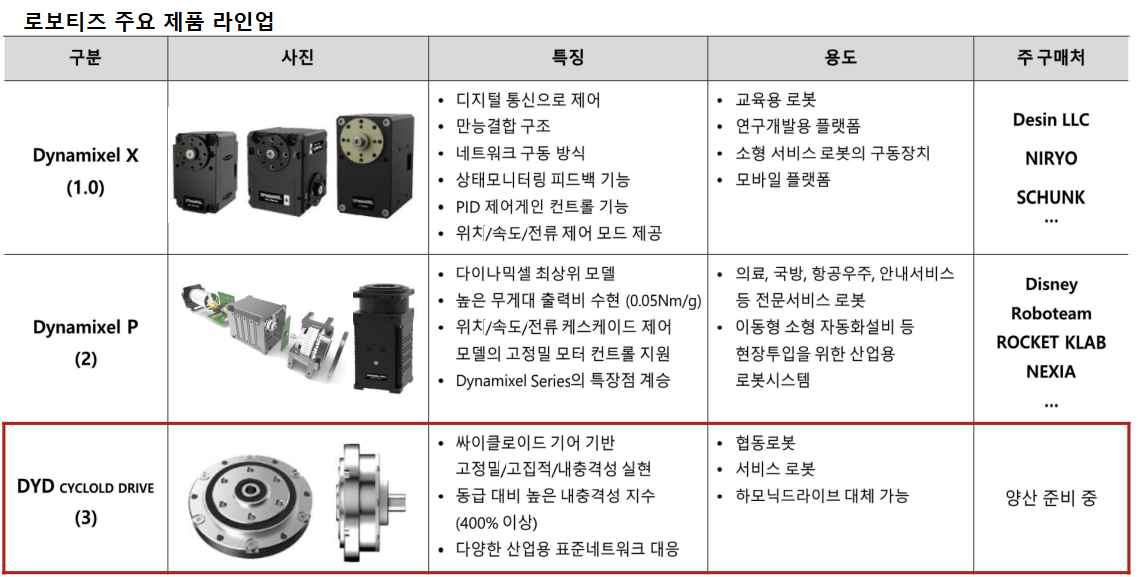 로보티즈는 정부의 정책적 지원을 토대로 전 세계 점유율 75% 이상인 일본 하모닉 드라이브 감속기를 대처할 사이클로이드 방식 감속기를 만들었다. 사이클로이드 감속기는 내부의 볼 베어링과 핀기어를 일체화해 내충격성(하모닉 드라이브 감속기 대비 400% 이상)을 확보했다.