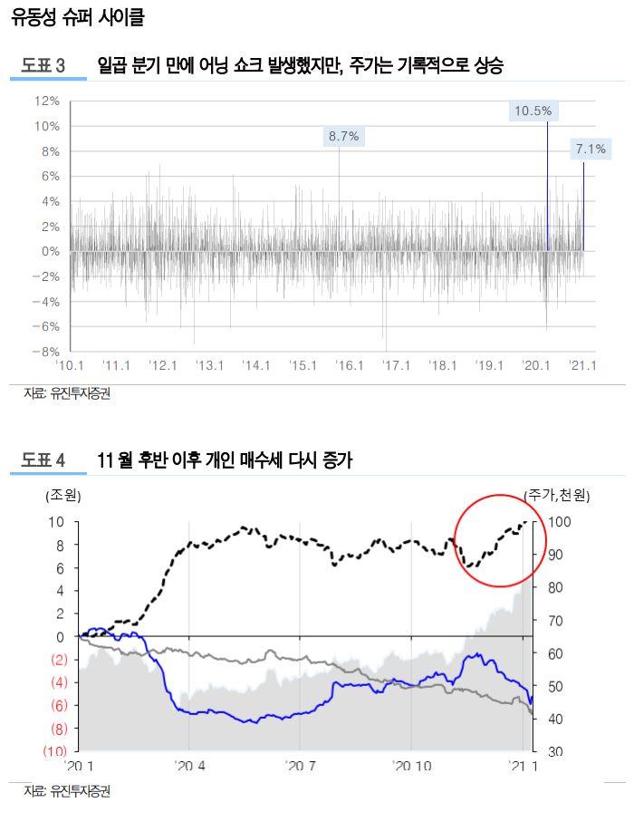 유진투자증권은 11일 삼성전자에 대해 주식 시장으로의 유동성 유입 효과와 비교 기업들의 주가 상승에 따른 상대 밸류에이션(가치) 상승 등을 반영해 목표 주가수익비율(PER)을 23배, 주가순자산비율(PBR)을 2.5배로 조정한다며 목표주가를 11만 원으로 상향하고, 투자의견은 '매수'를 유지했다.