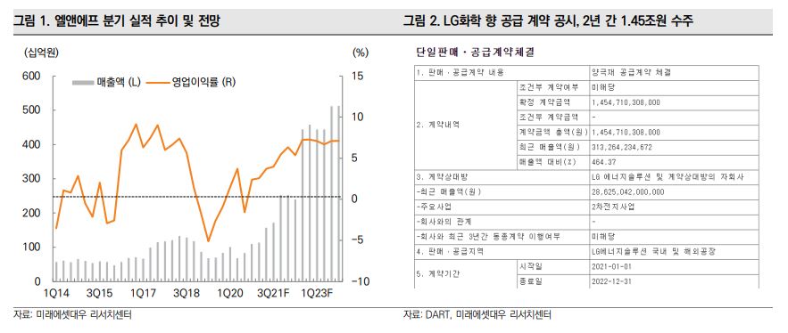 미래에셋대우는 이날 중장기 수요가 가장 높을 것으로 기대되는 테슬라 매출 비중에서 엘앤에프가 글로벌 소재 중 가장 높은 것을 전망 근거로 들었다. 또 LG화학과의 소송 해결 후 SK이노베이션의 중장기 사업 가시성이 확보될 것으로 예상했다.