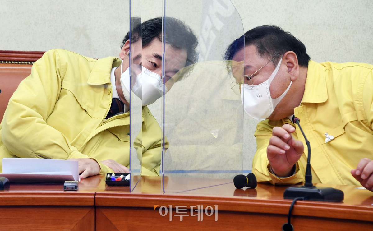 더불어민주당 이낙연(왼쪽)대표와 김태년 원내대표가 11일 국회에서 열린 최고위원회의에서 대화를 나누고 있다.