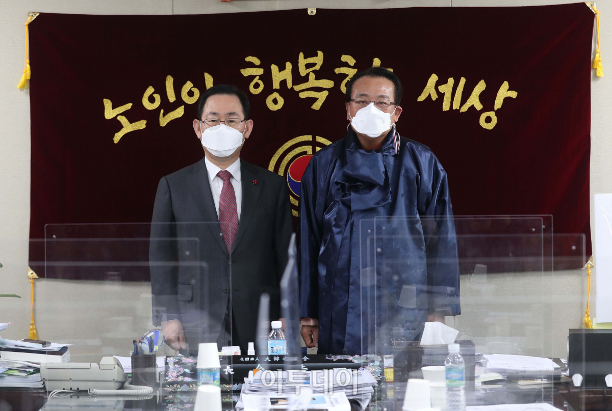 주호영(왼쪽) 국민의힘 원내대표가 11일 오전 서울 용산구 대한노인회 중앙회를 예방해 김호일 대한노인회장과 기념촬영을 하고 있다. 국회사진취재단