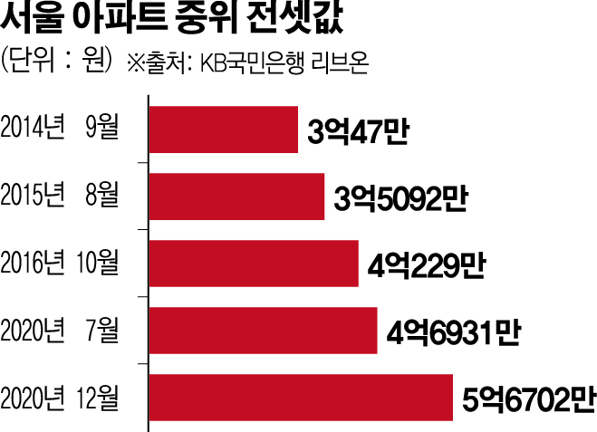 KB국민은행 통계에 따르면 서울 아파트 중위 전셋값은 지난해 7월 4억6931만 원에서 12월 5억6702만 원으로 9770만 원 올랐다. 임대차법 시행 후 5개월 만에 1억 원 가까이 치솟았는데, 이는 앞서 5년 동안의 상승분에 해당한다.