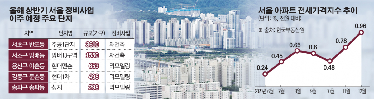 올해 들어 서울에서 재건축ㆍ재개발ㆍ리모델링 등 정비사업을 추진하는 단지들의 이주가 본격적으로 시작된다. 임대차 시장에 대규모 정비사업 이주 수요가 대거 유입되면 주변 지역 전셋값이 가파르게 오를 가능성이 크다. 개정 주택임대차보호법(계약갱신청구권ㆍ전월세상한제) 시행 이후 매물이 마르고 가격이 치솟고 있는 서울 아파트 전세시장이 한층 더 불안해질 수 있다는 우려가 나오는 이유다.
