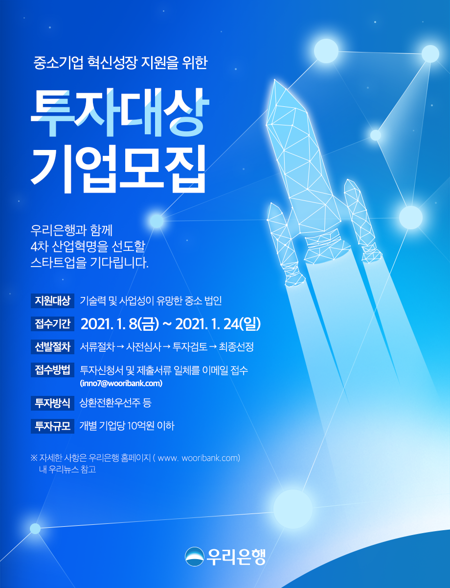 우리은행은 중소기업의 혁신성장을 적극적으로 도모하고자 ‘제7차 중소기업 혁신성장 지원을 위한 투자대상기업 공모’를 24일까지 실시한다고 12일 밝혔다.