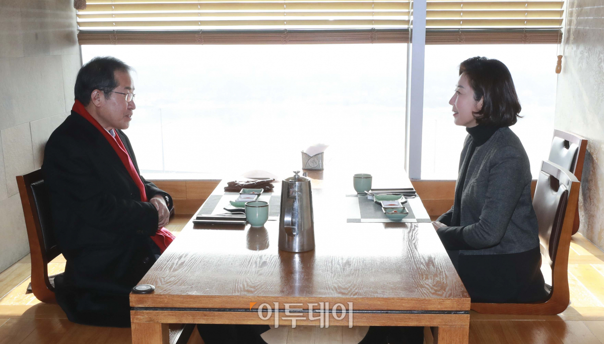 홍준표 의원과 나경원 전 의원이 12일 오후 서울 마포구의 한 식당에서 오찬 회동을 하고 있다. 국회사진취재단