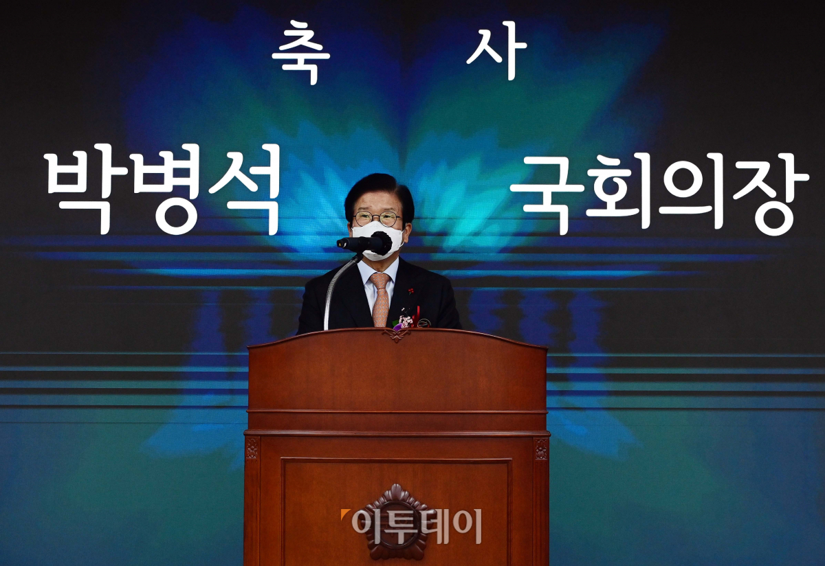 박병석 국회의장이 12일 국회에서 열린 이음마당 LED 전광판 제막식에서 축사를 하고 있다.