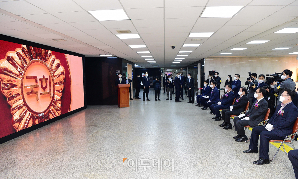 박병석 국회의장과 김태년 더불어민주당 원내대표, 주호영 국민의힘 원내대표가 12일 국회에서 열린 이음마당 LED 전광판 제막식에서 영상을 시청하고 있다.