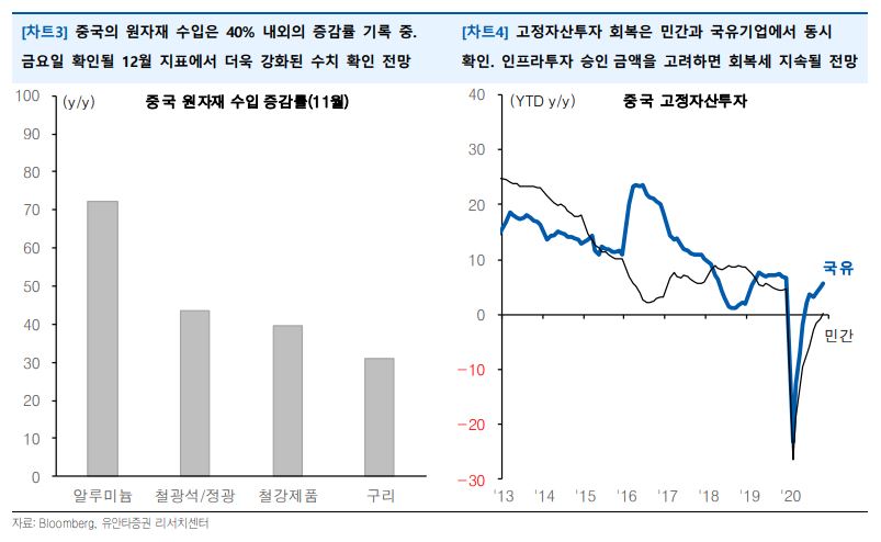 13일 민병규 유안타증권 연구원은 “국제통화기금(IMF) 역시 중국의 수요 회복을 견인할 투자 회복이 지속될 것으로 예상하고 있다”며 “중국의 투자증감률은 2019년 무역분쟁과 2020년 신종 코로나바이러스 감염증(코로나19)로 인해 둔화되는 흐름을 보여왔지만, 올해는 +7.1%로 강화될 것”이라고 내다봤다.