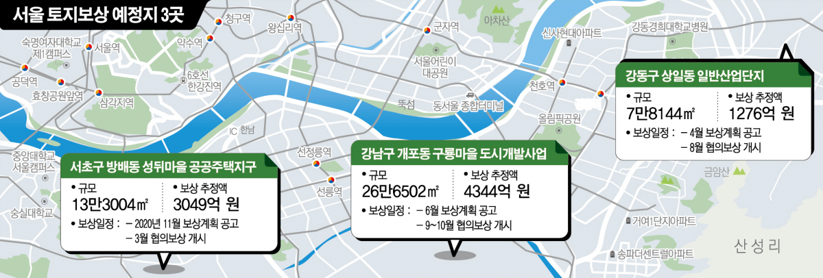 올해 서울에서 토지 보상금이 풀리는 개발지가 모두 강남권에 몰렸다. 강남구 개포동 구룡마을 도시개발구역, 서초구 방배동 성뒤마을 공공주택지구, 강동구 상일동 일반산업단지 등이다.