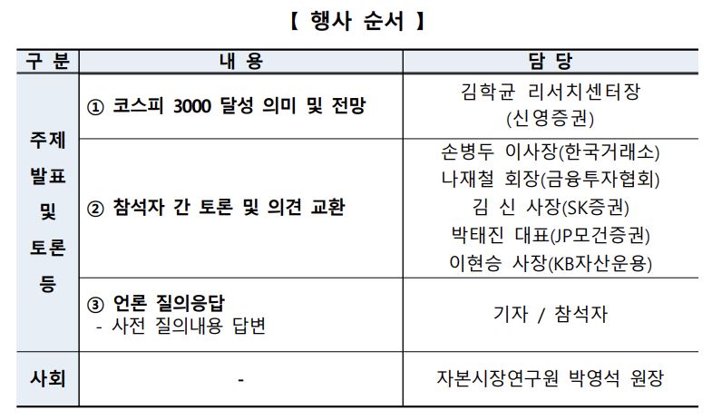먼저 김학균 신영증권 리서치센터장은 사상 최초 코스피 3000포인트 돌파 배경과 의미를 분석한 후 전망을 제시한다. 이어 자본시장 관계기관 대표로 구성된 CEO 좌담회를 통해 코스피 3000 시대를 맞아 참석자 간 토론을 진행할 계획이다.