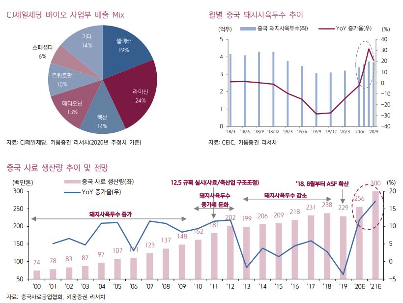 박상준 키움증권 연구원은 “중국 돼지사육두수 확대와 곡물가격 상승으로 인해, 사료용 아미노산의 슈퍼 사이클(Super Cycle)이 시작되고 있다”면서 “CJ제일제당 바이오 사업부의 실적 추정치 상향 가능성에 관심을 가져야 한다”고 말했다.