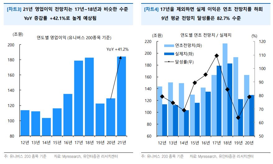 유안타증권은 15일 "유니버스 200종목 기준 2021년 영업이익 전망치는 184조 원으로 예상되고 있는데, 이는 2017년의 179조1000억 원, 2018년의 183조 원과 비슷한 수준"이라며 "(국내 증시의 상승세는) 지표로 설명하기는 쉽지 않으며, 이익은 2017~2018년과 비슷한 수준인데 이미 증시는 그보다 높은 곳에 있다"고 진단했다.