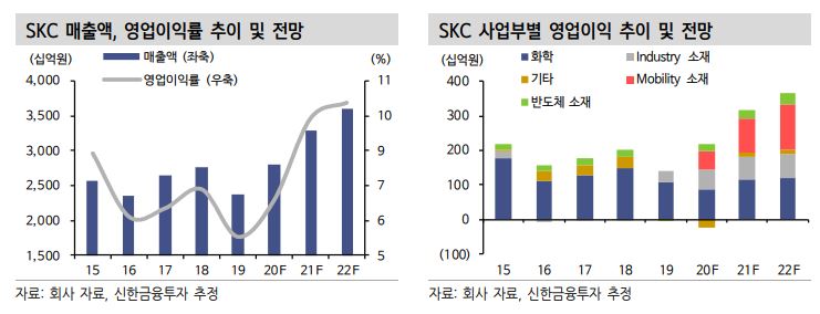 신한금융투자는 SKC의 4분기 영업이익은 607억 원으로 시장기대치에 부합할 것으로 전망했다. 모바일러티 소재 매출과 이익은 전 생산라인 풀가동으로 각각 42%, 44% 성장을 예상했다.