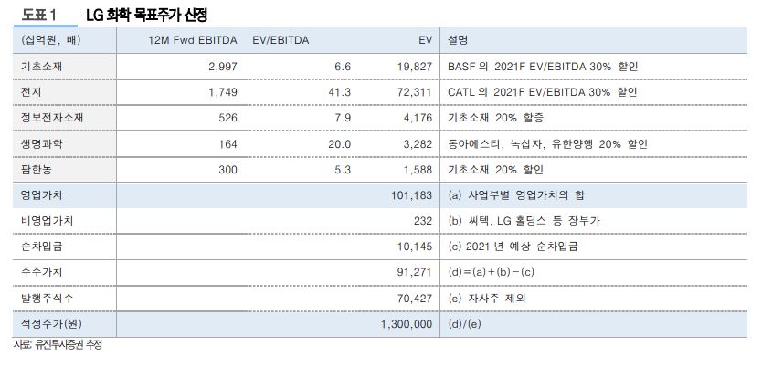 유진투자증권은 LG화학 목표주가를 130만 원으로 상향 조정한다고 15일 밝혔다. 공격적인 증설 계획과 글로벌 시장점유율 확대 고려 시 밸류에이션(가치)이 높아진다는 판단에서다.