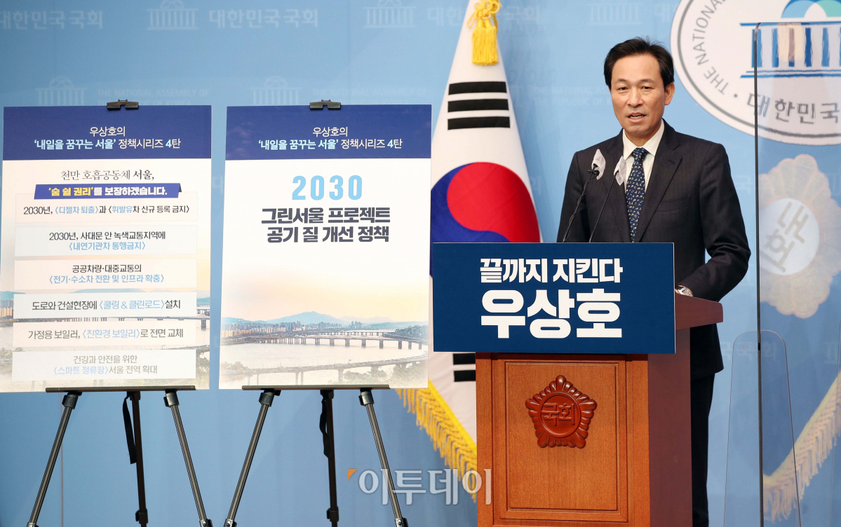 서울시장 보궐선거 출마를 선언한 더불어민주당 우상호 의원이 17일 서울 여의도 국회 소통관에서 '내일을 꿈꾸는 서울' 정책발표 4탄 ‘2030그린서울프로젝트’를 발표하고 있다.