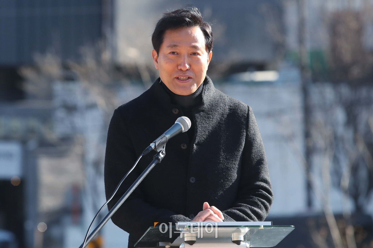 국민의힘 소속 오세훈 전 서울시장이 17일 오전 서울 강북구 북서울꿈의숲에서 기자회견을 열고 서울시장 보궐선거 출마를 선언하고 있다. 국회사진취재단