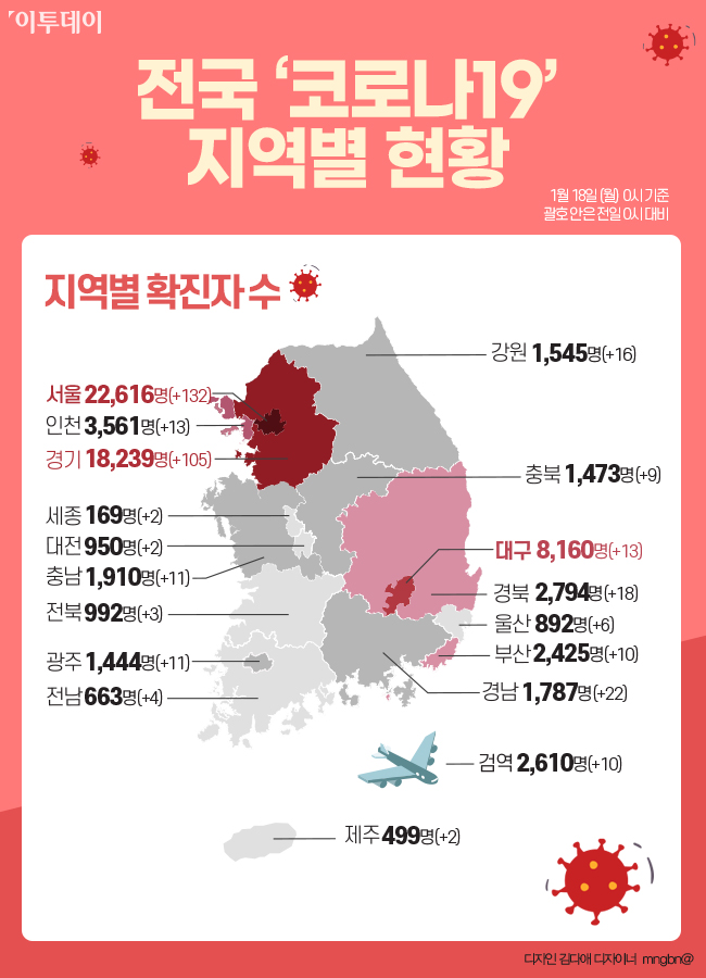 이로써 전국 시·도별 코로나19 확진자 수는 △서울 2만2616명 △경기 1만8239명으로 가장 많은 비중을 차지했다. 이어 △대구 8160명 △인천 3561명 △경북 2794명 △검역소 2610명 △부산 2425명 △충남 1910명 △경남 1787명 △강원 1545명 △충북 1473명 △광주 1444명 △전북 992명 △대전 950명 △울산 892명 △전남 663명 △제주 499명 △세종 169명 순으로 나타났다.