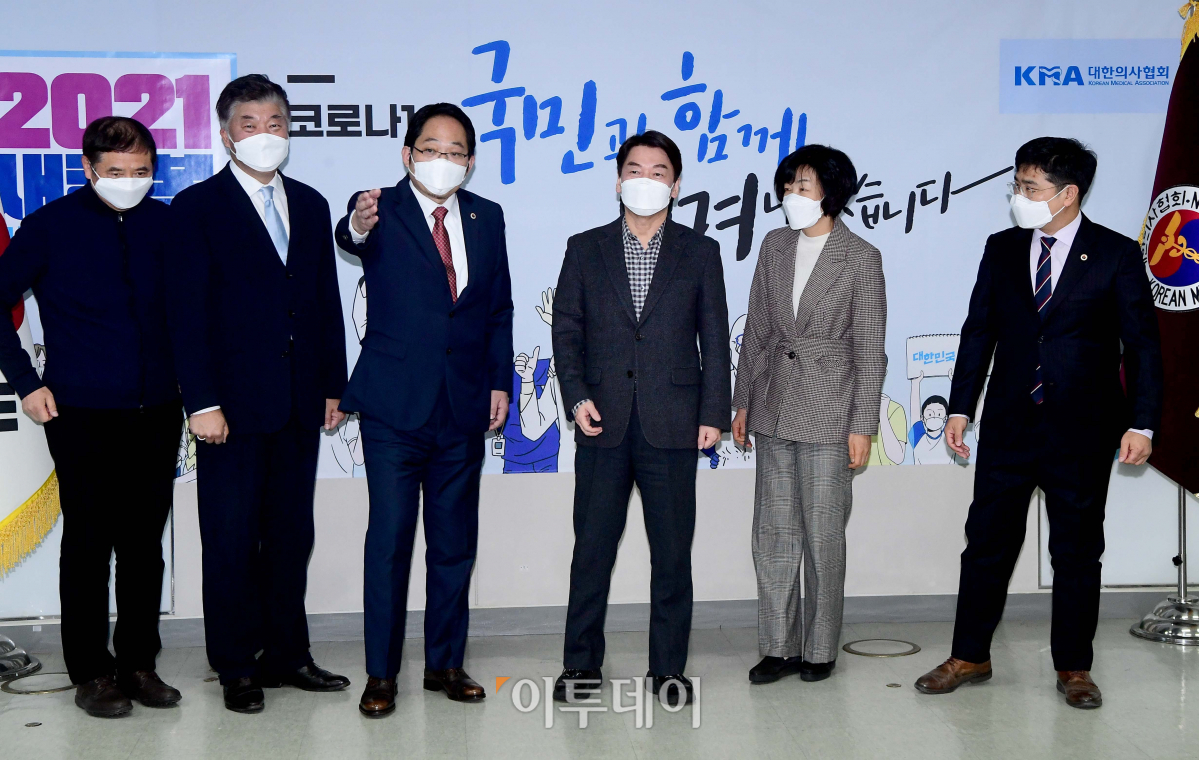 안철수(가운데) 국민의당 대표가 18일 서울 용산구 대한의사협회에서 열린 ‘코로나19 대응 및 백신 접종 계획 관련 국민의당-대한의사협회 간담회’에서 최대집 대한의사협회장에게 자리를 안내받고 있다.