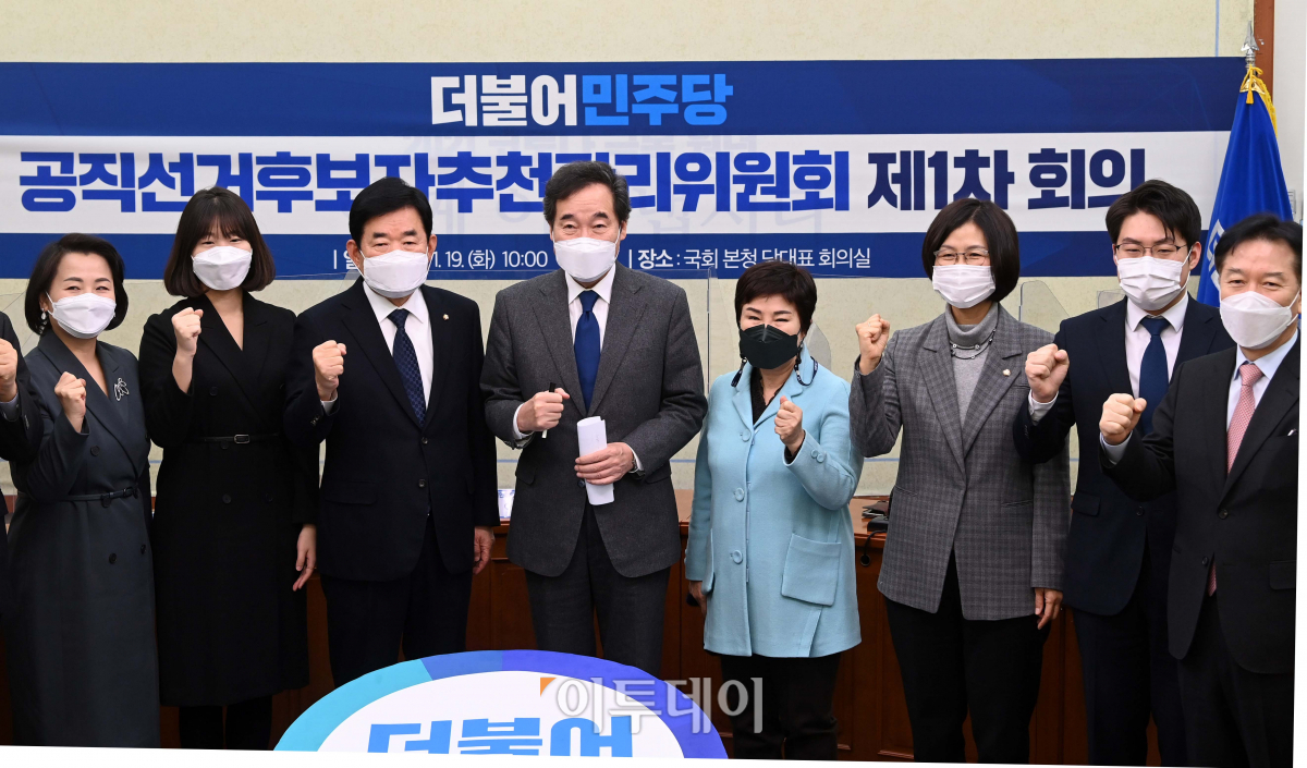 19일 오전 국회에서 열린 더불어민주당 4.7 재보선 공관위 회의에서 이낙연 대표가 참석자들과 기념촬영을 하고 있다.