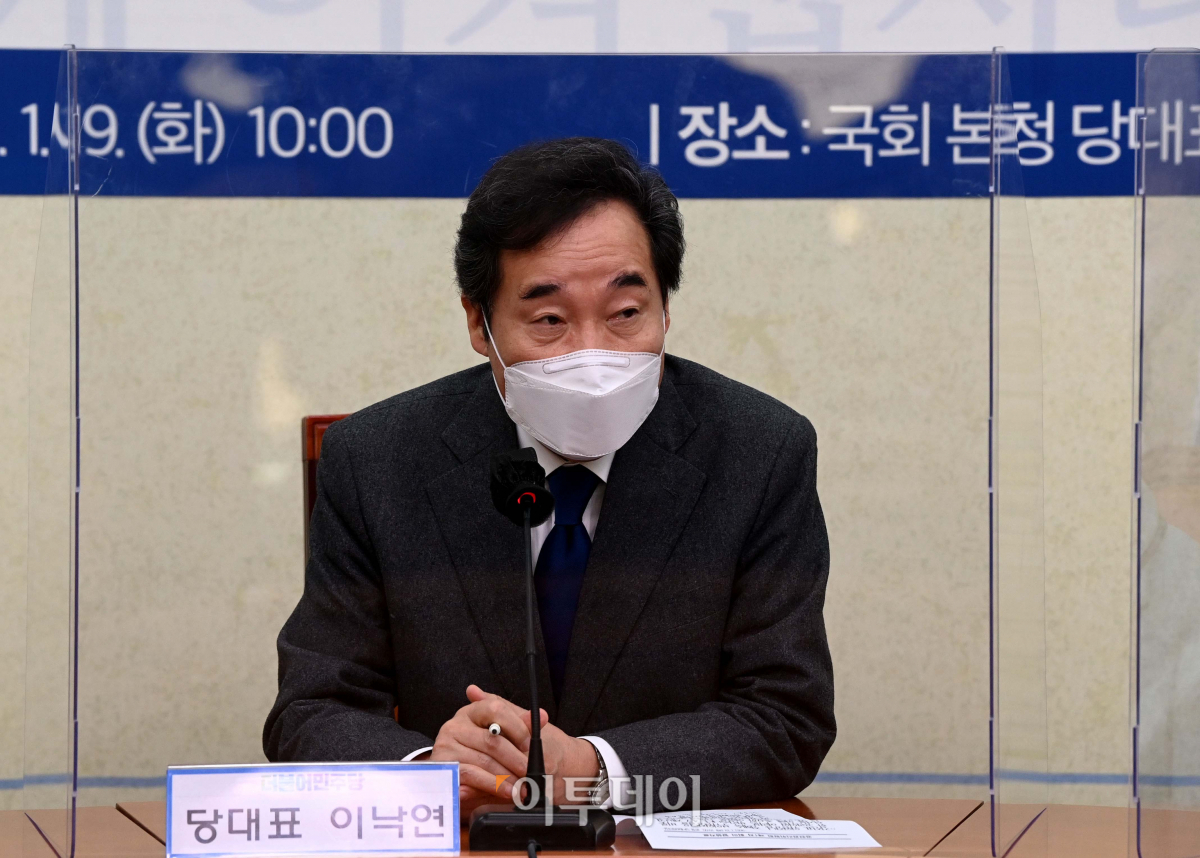 19일 오전 국회에서 열린 더불어민주당 4.7 재보선 공관위 회의에서 이낙연 대표가 인사말을 하고 있다.