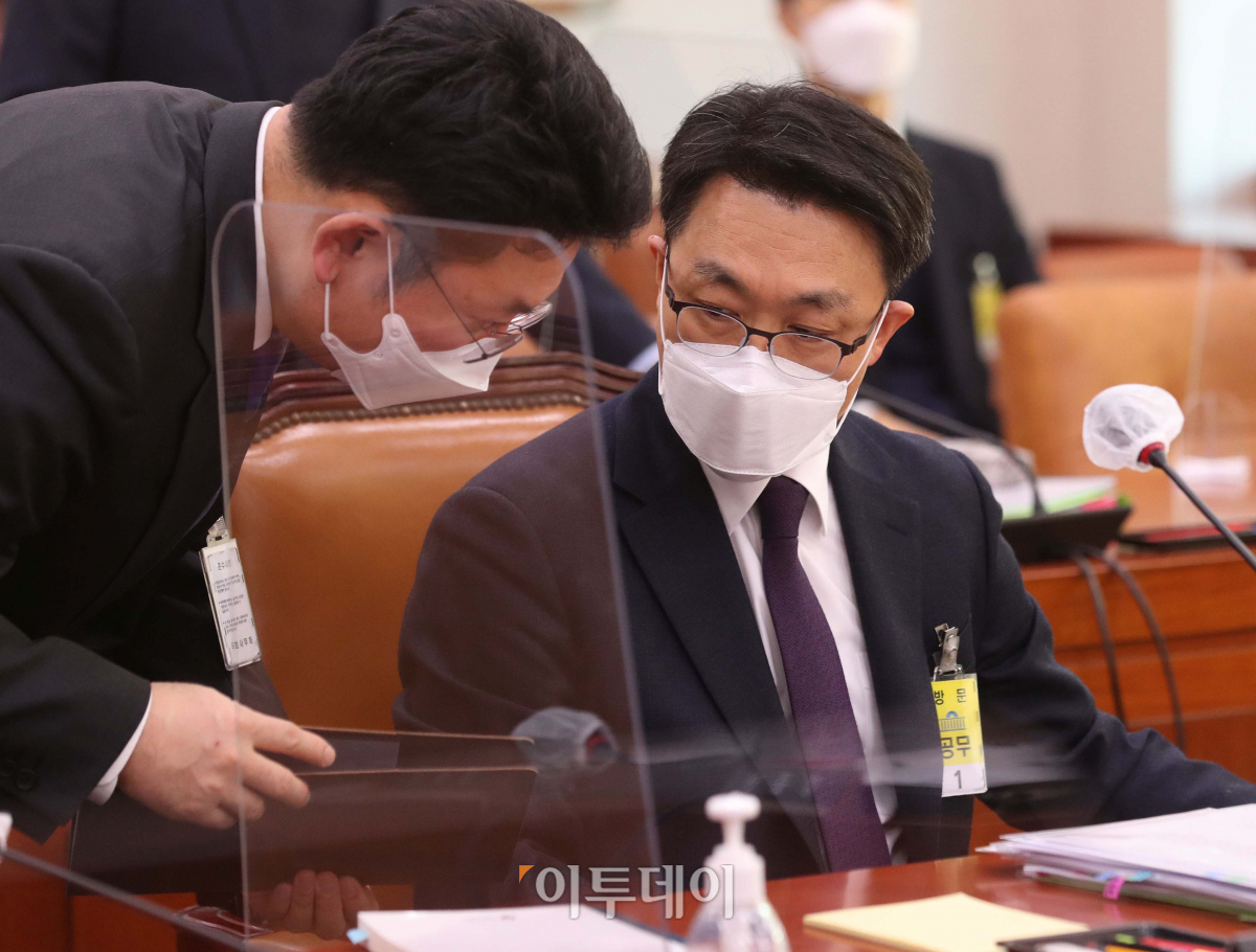 김진욱 초대 고위공직자범죄수사처장(공수처장) 후보자가 19일 오전 서울 여의도 국회 법제사법위원회에서 열린 인사청문회에 출석해 관계자와 대화하고 있다.
