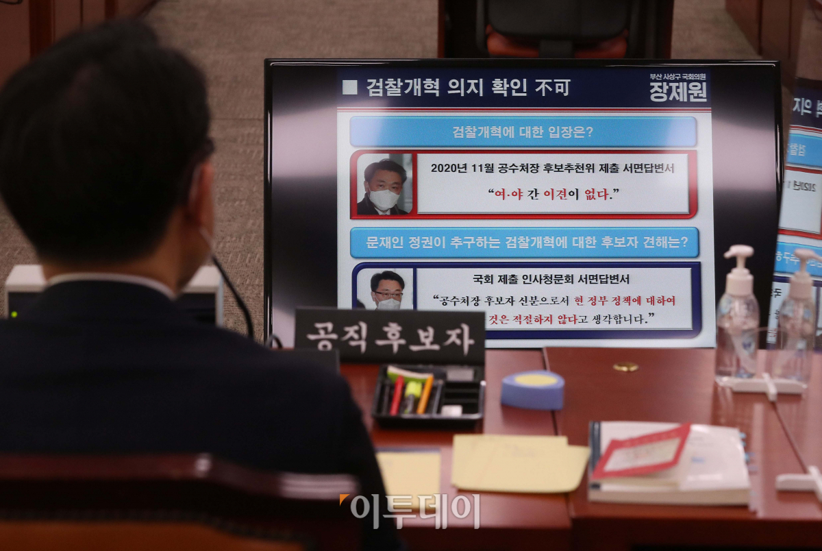 김진욱 초대 고위공직자범죄수사처(공수처) 처장 후보자가 19일 오전 서울 여의도 국회 법제사법위원회에서 열린 인사청문회에 출석해 의원들의 질의를 듣고 있다.