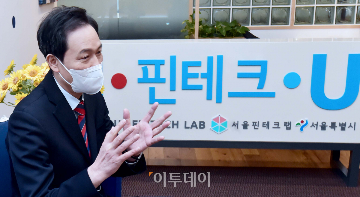 4.7 재보궐 선거 출마를 선언한 우상호 더불어민주당 의원이 19일 서울 영등포구 의사당대로 오투타워에 위치한 서울핀테크랩 금융정책 현장을 방문, 간담회를 갖고 있다.