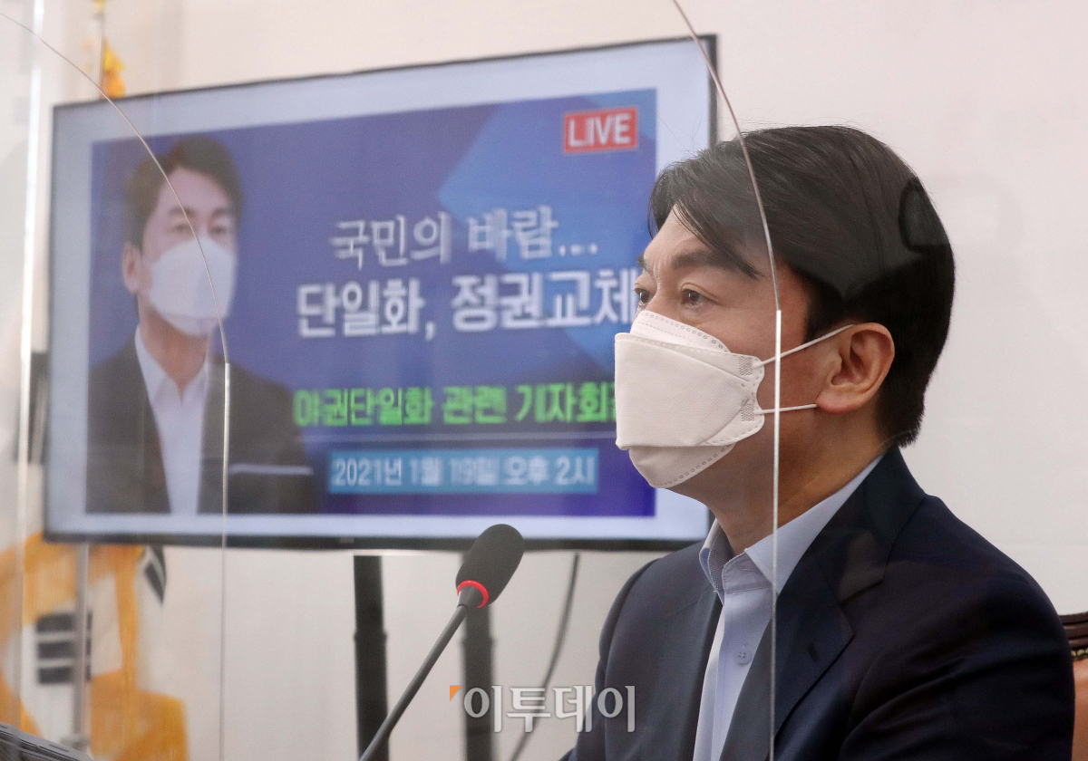 안철수 국민의당 대표가 19일 오후 서울 여의도 국회에서 야권단일화 관련 기자회견을 하고 있다. 안 대표는 "국민의힘 경선플랫폼을 야권 전체에 개방해주십시오"라고 제안하며 야권 승리를 위해 개방형 경선플랫폼에 참여하겠다고 밝혔다.