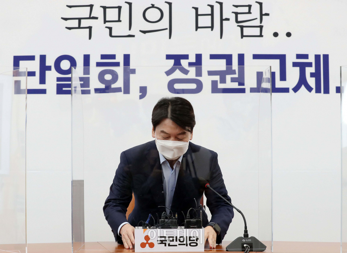 안철수 국민의당 대표가 19일 오후 서울 여의도 국회에서 열린 야권단일화 관련 기자회견에 참석하고 있다. 안 대표는 "국민의힘 경선플랫폼을 야권 전체에 개방해주십시오"라고 제안하며 야권 승리를 위해 개방형 경선플랫폼에 참여하겠다고 밝혔다.