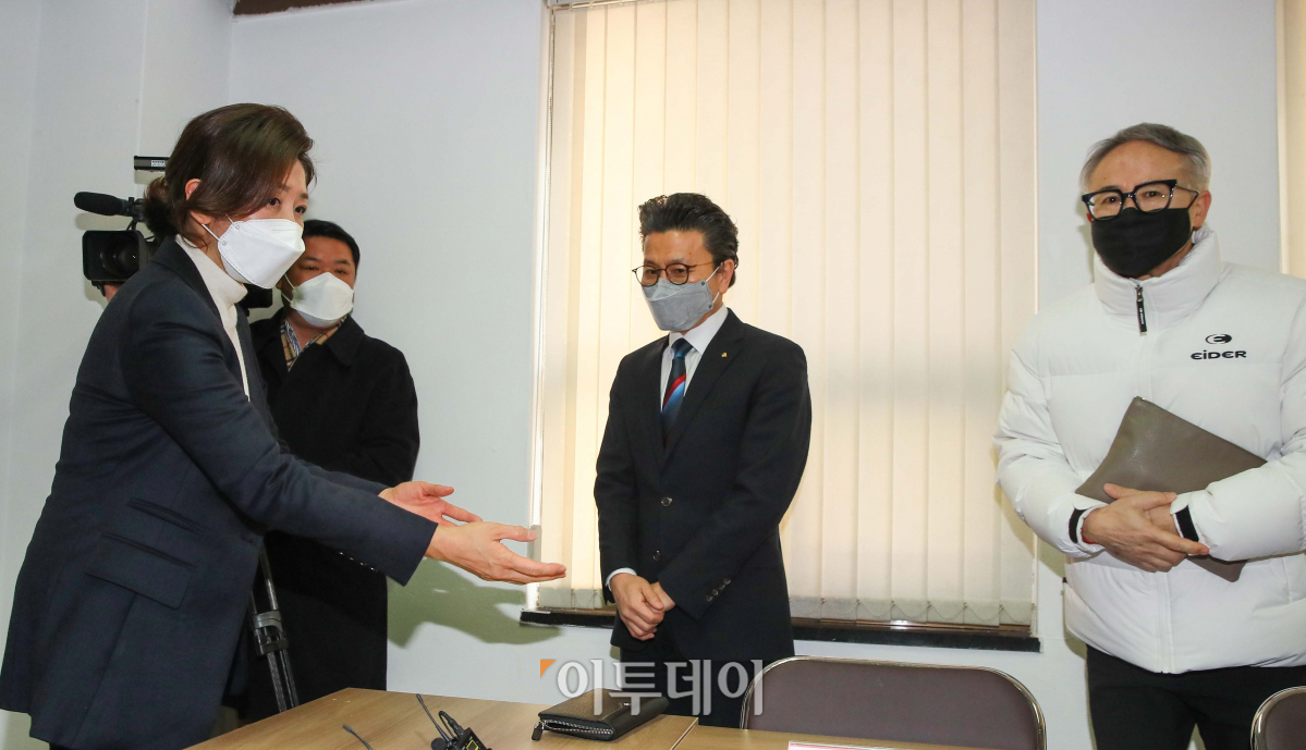 서울시장 선거에 출마한 국민의힘 나경원 전 의원(왼쪽부터)이 19일 서울 여의도 사무실에서 전국입양가족연대 오창화 수석대표, 신용운 공동대표외 인사하고 있다.