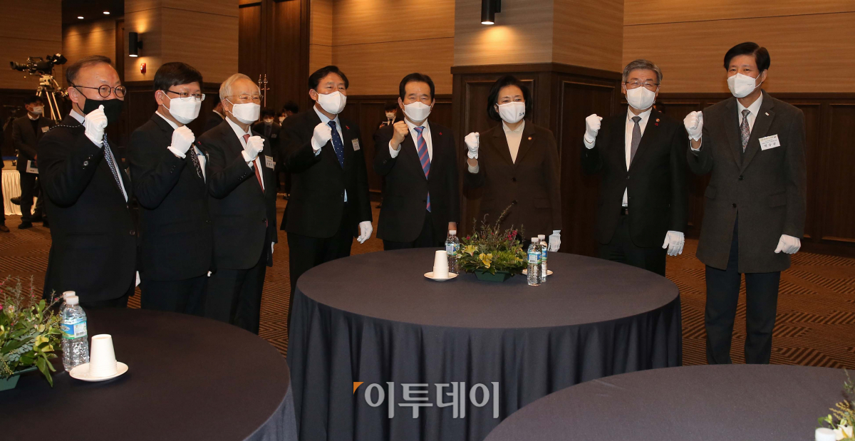 19일 오후 서울 여의도 중소기업중앙회에서 열린 중소기업인 신년 인사회에 정세균 국무총리와 박영선 중소벤처부장관, 이낙연 더불어민주당 대표, 김종인 국민의힘 비상대책위원장 손경식 한국경영자총협회장 김기문 중소기업중앙회장 등을 비롯한 참석자들이 기념촬영을 하고있다. 국회사진취재단
