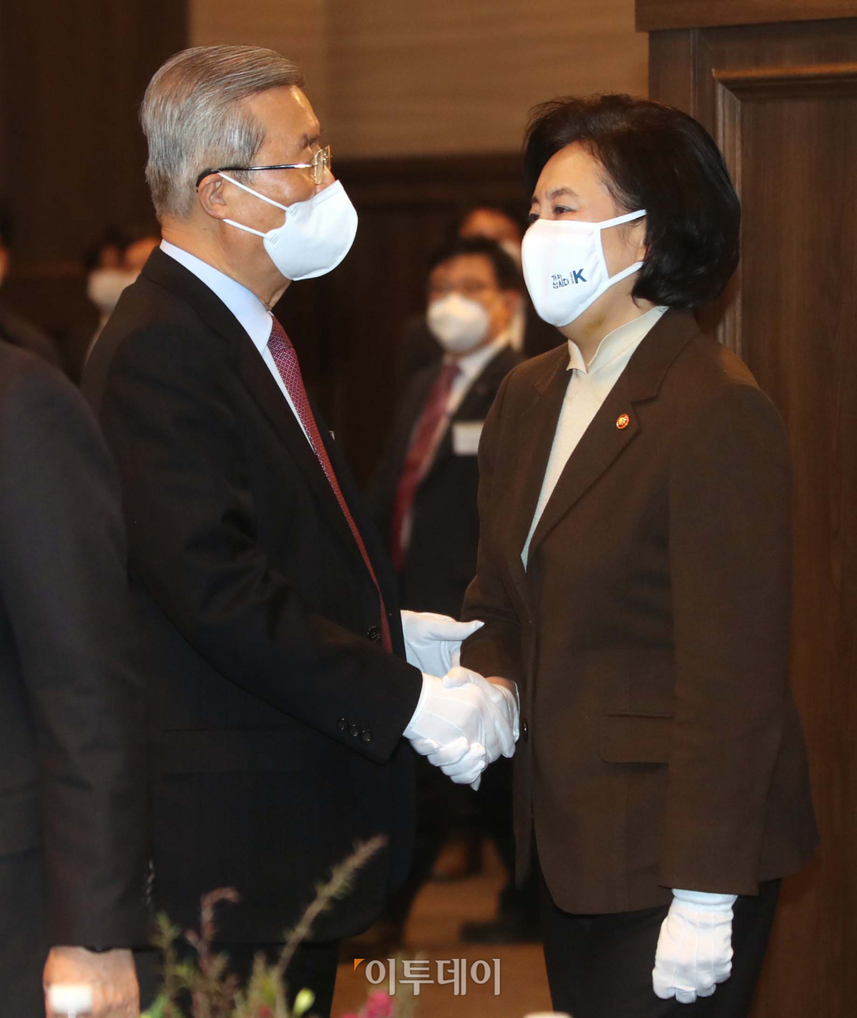 19일 오후 서울 여의도 중소기업중앙회에서 열린 중소기업인 신년 인사회에 박영선 중소벤처기업부 장관과 김종인 국민의힘 비상대책위원장이 인사를 하고 있다. 국회사진취재단
