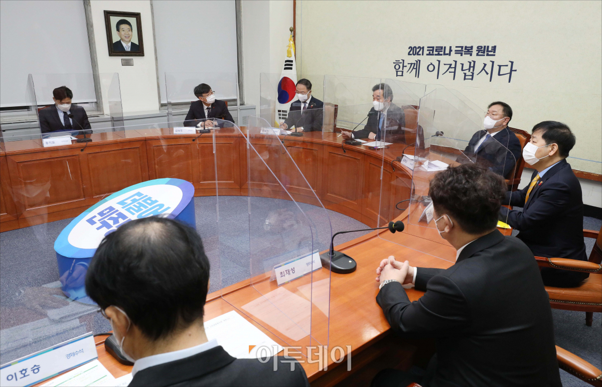 20일 오전 서울 여의도 국회에서 더불어민주당 이낙연 대표와 김태년 원내대표, 홍남기 경제부총리 겸 기획재정부 장관, 청와대 김상조 정책실장, 최재성 정무수석, 이호승 경제수석 등이 참석한 가운데 고위당정협의회가 열리고 있다.