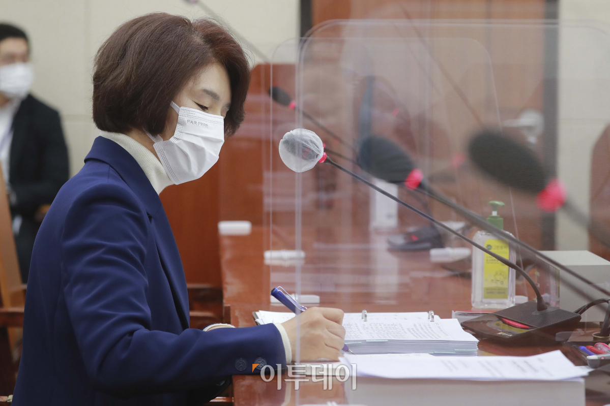 한정애 환경부 장관 후보자가 20일 오전 서울 여의도 국회 환경노동위원회에서 열린 인사청문회에서 의원질의를 받고 있다.
