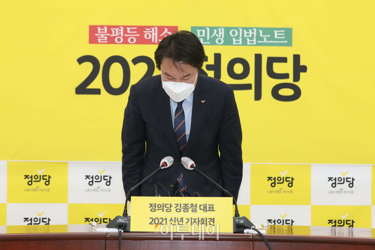 정의당 김종철 대표가 20일 국회에서 신년기자회견에서 인사하고 있다.