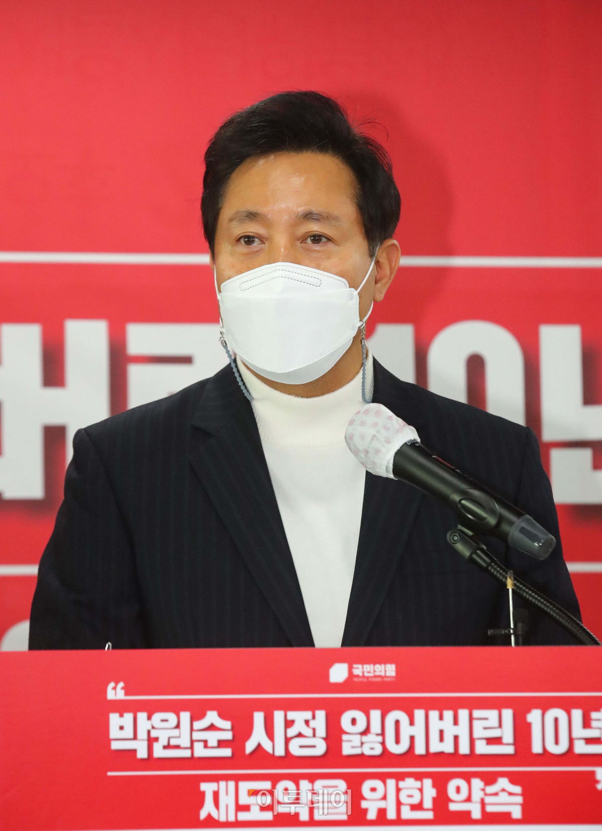 서울시장 보궐선거 출마를 선언한 오세훈 전 서울시장이 20일 서울 여의도 국민의힘중앙당사에서 열린 '박원순 시정 잃어버린 10년 재도약을 위한 약속' 발표회에서 인사말을 하고 있다.