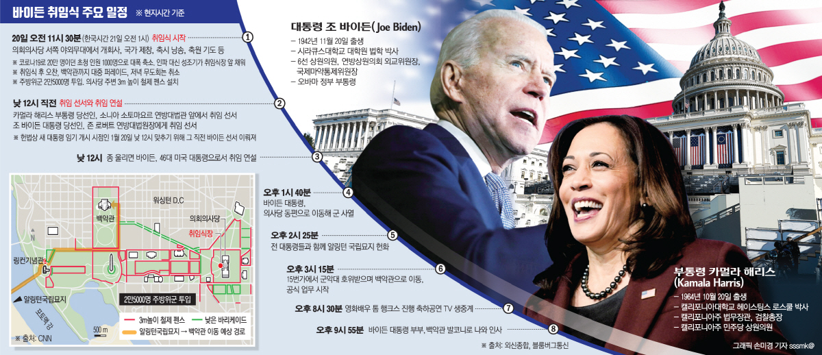 바이든은 20일(현지시간) 신종 코로나바이러스 감염증(코로나19) 사태와 6일 전임자 도널드 트럼프 지지자들의 의사당 난입 후폭풍에 ‘요새’로 변해버린 워싱턴D.C.에서 취임 선서를 하고 46대 대통령으로서 4년 임기를 시작했다. 취임 일성은 ‘통합’이었다. 그만큼 트럼프 전 정부가 남긴 분열과 대립을 뒤로하고 새 페이지를 열어야 한다는 절박함이 담겼다.