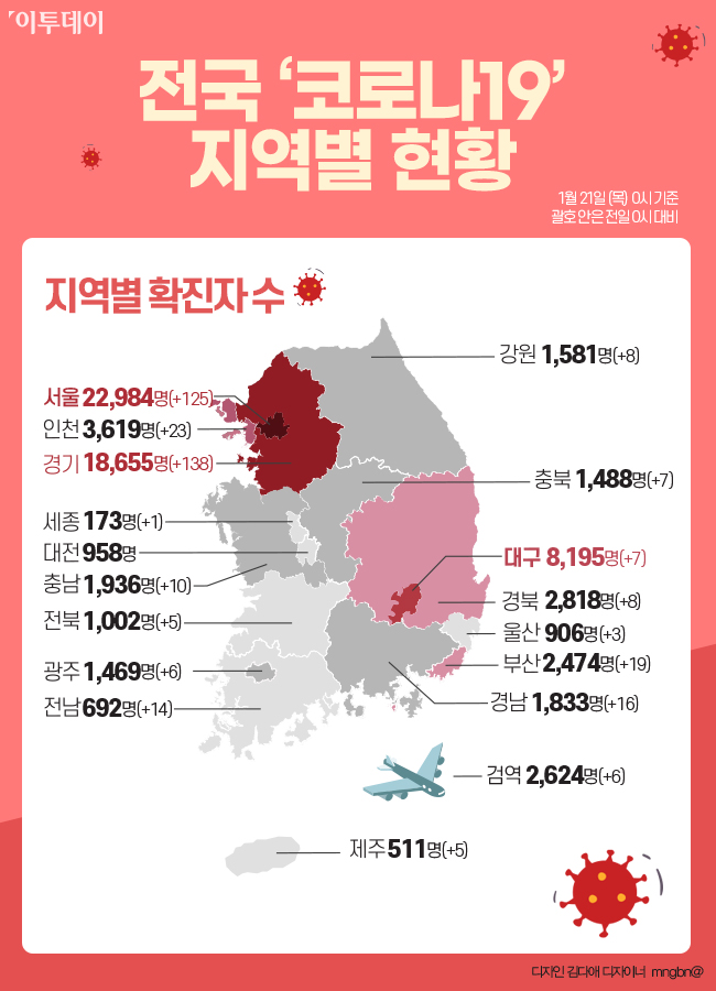 질병관리청 중앙방역대책본부에 따르면 1월 21일 0시 기준, 전일 0시 대비 401명이 추가 확진 판정을 받아 전국 확진자 수는 7만3918명으로 늘었다.