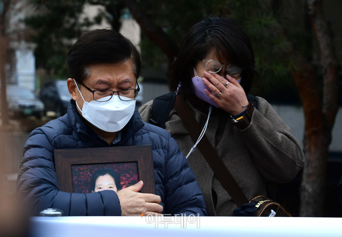 21일 서초구 서울중앙지방법원 앞에서 가습기살균제참사피해자총연합회 회원들이 ‘가습기 살균제 사건’ 관련 기업 1심 무죄 선고를 규탄하는 기자회견을 갖고 있다.