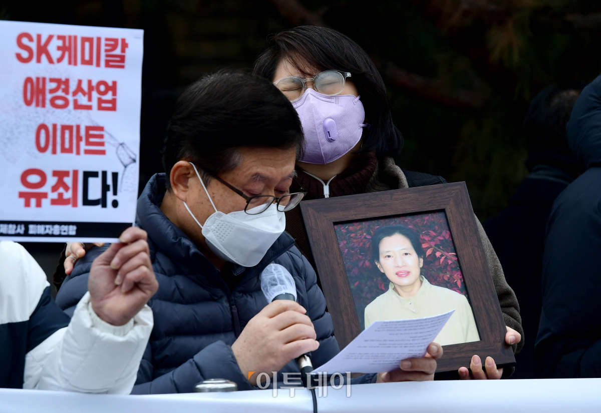 21일 서초구 서울중앙지방법원 앞에서 가습기살균제참사피해자총연합회 회원들이 ‘가습기 살균제 사건’ 관련 기업 1심 무죄 선고를 규탄하는 기자회견을 갖고 있다.
