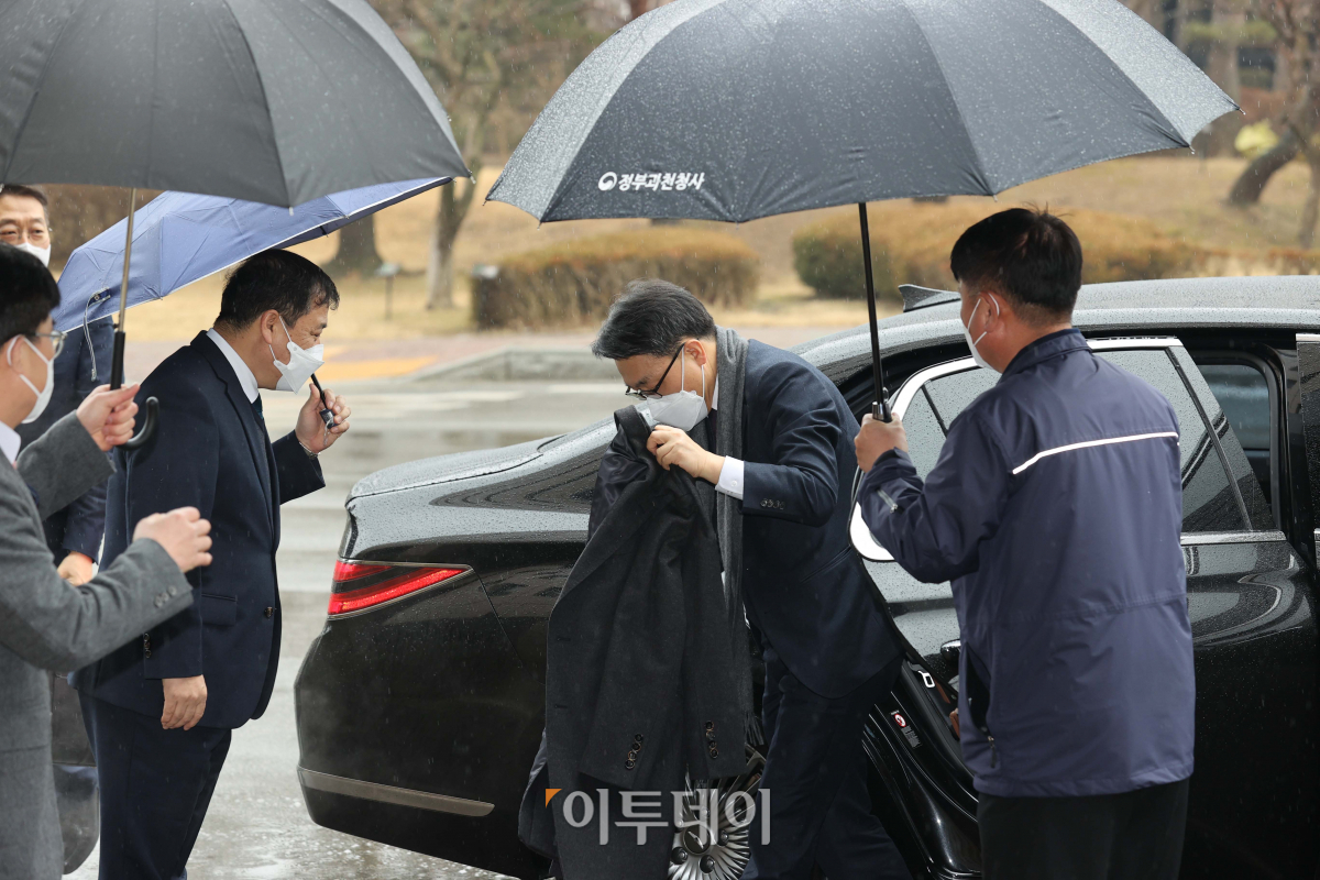 21일 오전 문재인 대통령에게 임명장을 받은 김진욱 고위공직자범죄수사처(공수처) 초대 처장이 같은날 오후 취임식이 예정된 경기 과천시 정부과천청사로 출근하고 있다.