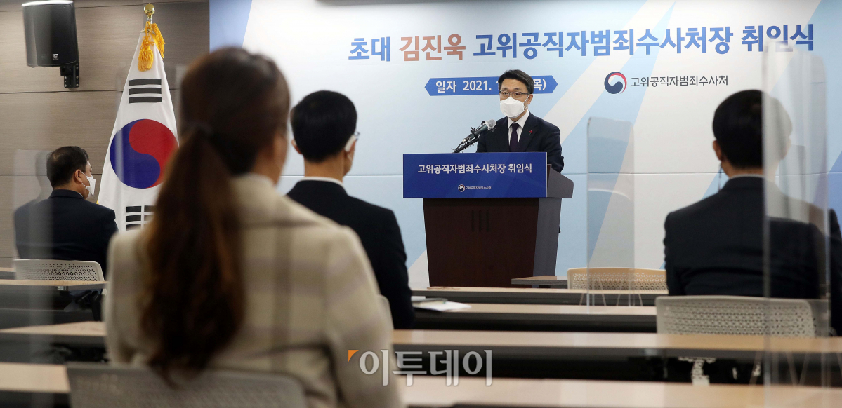 김진욱 고위공직자범죄수사처장이 21일 오후 경기 과천시 정부과천청사에서 열린 취임식에서 취임사를 하고 있다.