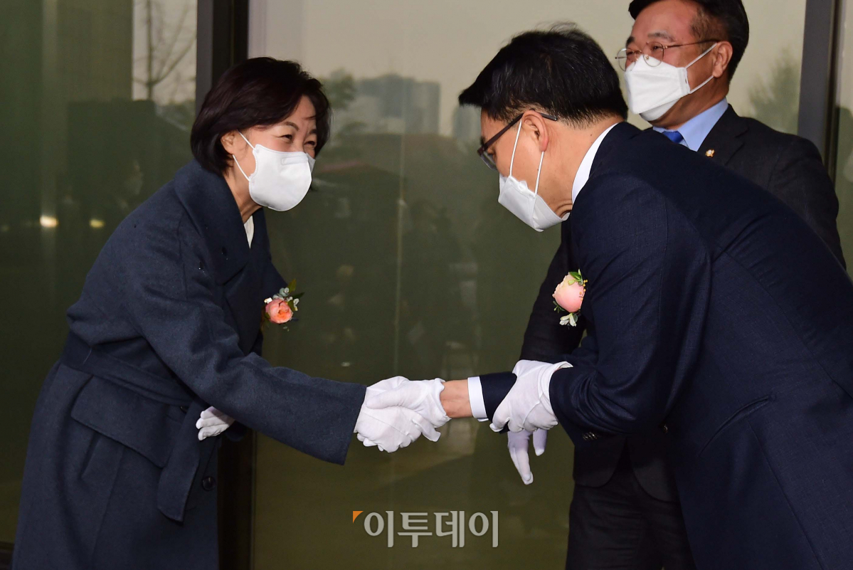 추미애 법무부 장관과 김진욱 초대 고위공직자범죄수사처장이 21일 경기 정부과천청사에서 열린 고위공직자범죄수사처 현판 제막식을 마친 뒤 악수하고 있다.