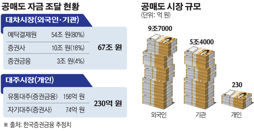 한국증권금융에 따르면 대차시장(외국인·기관)은 외국인과 증권사, 자산운용사 등 67조 원 규모의 시장이 형성돼 있다. 이 중 차입 매도 공매도 시장은 총 15조 원 규모로 추정된다. 반면 대주시장(개인시장)은 총 230억 원이며, 공매도 시장 규모 또한 230억 원에 불과한 것으로 추정된다.