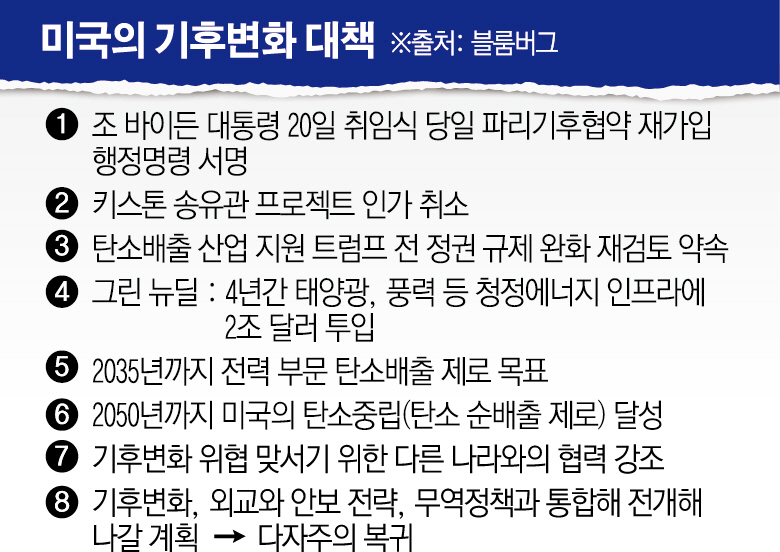 바이든이 부통령이었던 버락 오바마 시대 미국은 글로벌 기후변화 대응을 주도했다. 그러나 도널드 트럼프가 대통령이 되면서 미국은 기후변화 리더십을 잃어버리고 말았다.
