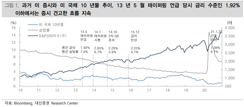 그러면서 “분명 증시 조정이 임박해 보일 정도로 명목 가격지표는 크게 올랐지만, 아직은 온전한 회복을 논하기에는 불확실한 경제 및 기업 경영환경을 감안하면 통화 및 재정정책이 이끄는 유동성 장세가 올해도 계속 이어질 것”이라고 설명했다.