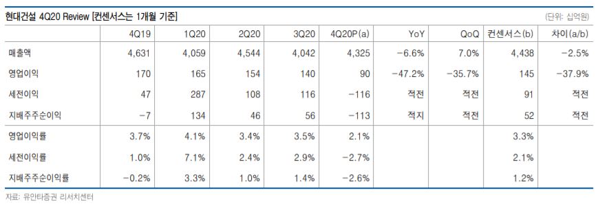 유안타증권은 현대건설의 지난해 4분기 연결 기준 실적은 매출액 4조3300억 원, 영업이익 899억 원을 기록했다고 밝혔다. 신종코로나바이러스 감염증(코로나19) 및 신규 수주 현장의 매출 인식 지연으로 해외부문 매출은 지난해 같은 기간보다 23.8% 감소하며 부진했다.