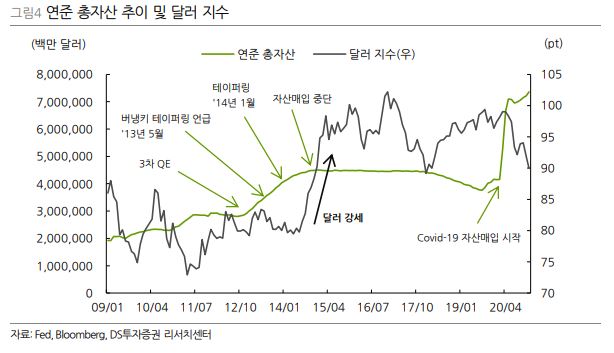 나정환 DS투자증권 연구원은 "미국 국채 금리가 오르면 자금은 다시 미국으로 유입되면서 달러가 강세로 전환될 수 있다"며 "2013년 5월 버냉키 전 연준 의장이 테이퍼링에 대해 언급한 이후 금리가 크게 상승하면서 달러가 곧 강세로 전환됐다"고 설명했다.