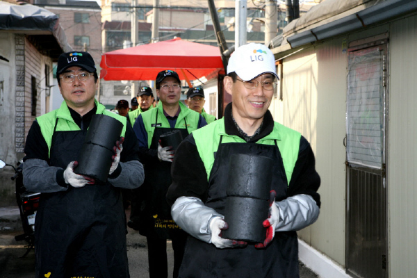 '희망봉사한마당'은 연말을 맞아 다양한 사회공헌 사업을 집중적으로 펼치는 LIG손해보험의 나눔 캠페인으로, 특히 이날 연탄배달에는 김우진 사장 이하 본사 재직 임원이 한 명도 빠짐없이 참가했다.