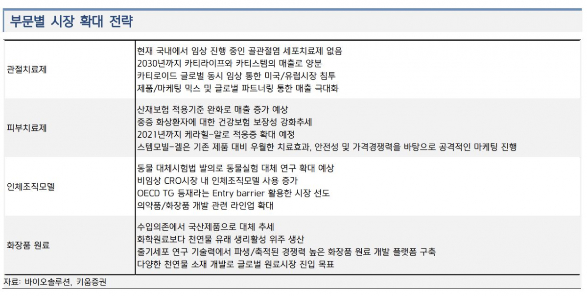 키움증권은 26일 바이오솔루션 기업탐방 보고서를 통해 “골관절염 세포치료제 카티라이프의 약사위원회(DC) 통과 병원이 늘어나고 있고, 창상피복제 스템모빌겔 출시로 올해 매출이 개선될 것”이라고 전망했다.